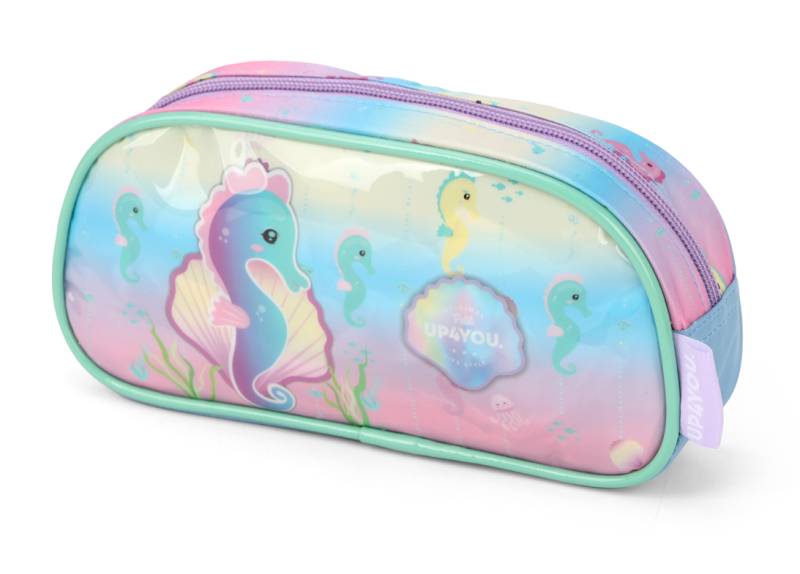 Possui um corpo de revestimento plástico transparente (PVC cristal) estampado frente e verso, capa de papel, fechamento em botão, 10 divisórias plásticas e 192 folhas pautadas simples de gramatura 56g/m².